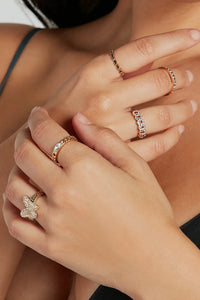 Accessorize your summer 'fits with the cutest glam rhinestone ring set! The multi-pack features five varying rings with mini rhinestone embellishments, thin band designs, chain-link designs, textured designs, and an adorable butterfly-shaped design. Style the set all together with a dainty bracelet.