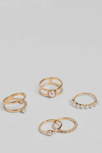 Polished and poised, this five-pack ring set give your look stackable chicness! It features a set of five rings with faux pearl or rhinestone embellishments in various fashion designs. Complete the look in a classic black dress for any occasion!
