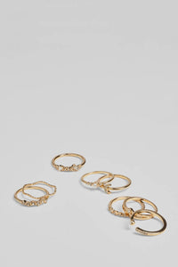 A six-pack ring set featuring glamorous designs and styles some with sparkly rhinestone embellishments that dress up any look.