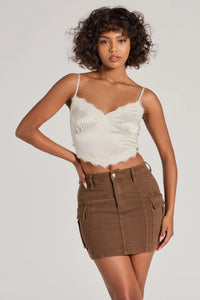 This form-fitting cargo twill mini skirt will give you that effortlessly cool look you've been seeing all over your feed! It features a high-rise waist, a hidden front zipper and front button closure, side cargo-style pockets, a mini-length hem, and a form-hugging silhouette. Create an on-trend look for your weekend plans with a crop top and clear mules.