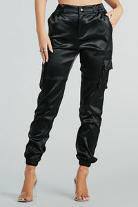 These satin cargo joggers will make everyone say she's got the look! The pants feature a high-rise waist with an elasticized back band ensuring a perfect fit while the side and cargo flap pockets provide functional convenience. The jogger style silhouette and elasticized hem add a trendy touch to these must-have joggers. Style with a crop top for weekend plans!