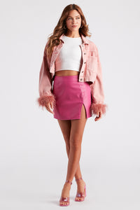 This sleek faux leather mini skirt is perf for your next girl's night out! It features a high-rise waist, a sultry side slit accent, a mini-length hem, and a form-hugging fit. Style with a corset top and mules!