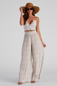 Can't you imagine wearing this striped halter top while sipping on a sangria? Set the tone for vacay-ready in these striped pants featuring a high-rise waist, paper bag style, and a wide-leg silhouette. Complete the look in the matching top.