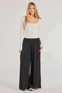 Chill in laidback luxe wide-leg palazzo pants. With a satin finish, mid-rise waist, and hidden pockets, they're your go-to for effortless style and comfort.