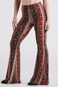 You'll be the trendiest gal at the festival or concert in these boho flare pants! They feature a flattering high-rise elastic waist, a hip-hugging fit, and a flared hem. The pants are designed with a floral striped print on stretchy brushed knit fabric. Complete the look in a crochet top and a hat.