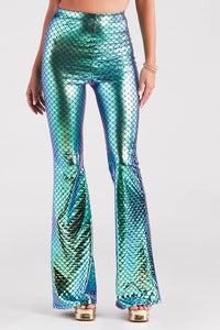 Go under the sea looking mesmerizing as a mermaid this Halloween! Create a sea-worthy glam costume with these flare pants featuring an elasticized high-rise waist, a hip-hugging fit, and a unique scale print. Complete the look with the bra top and bejeweled shell crown for a costume party!