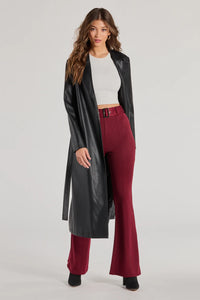 These faux leather pants feature a flattering high-rise waist, hip-hugging fit, and a trendy flare hem on coated fabric for a sleek look. Perfect for styling with a graphic tee and booties.