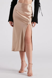 Step into the spotlight and keep all eyes on you in this alluring satin midi skirt! It features a high-rise waist, a hip-hugging silhouette, a midi-length flared-out hem, and a sultry thigh-high front slit to showcase some leg. The silky satin fabric has minimal stretch. Style with a corset top and over-the-knee boots.