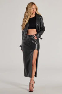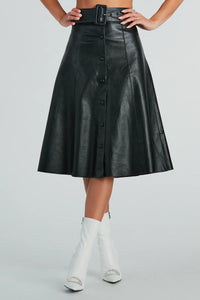 For the girl on the go, look sleek and classy in this faux leather midi skirt everywhere! The midi-length skirt features a high-rise belted waist, belt loop accents, a front button-down design, and a flattering A-line silhouette. Complete the look in a faux leather jacket and booties for a chic style!