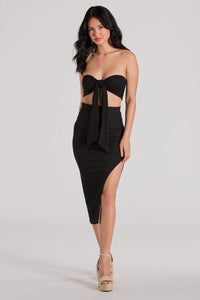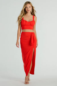 This airy woven midi skirt will bring the sunny vibes to your weekend plans! Designed with a lightweight woven fabric with a mini-length lining, it features a high waist with the cutest tie detail, a high-cut side slit to showcase some leg, and a flowy slim-fit silhouette. Style with the matching crop top for a fabulous 'fit!