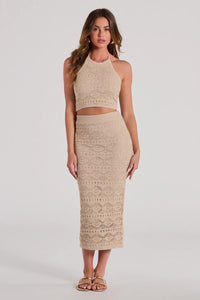 Enjoy stylish bliss in this crochet midi skirt on your next getaway or weekend outing! The skirt offers a flattering high-rise elasticized waist, a bodycon silhouette, and a midi-length hem. Complete the look with the matching top.