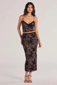 With this midi skirt, you won't be asking yourself if they love you not! It features a high-rise waist, bodycon silhouette, and a sultry velvet floral burnout pattern with a sewn-in knit lining. Complete the look with the matching top for a date!