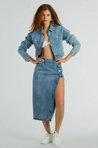 You're a fab style icon, so this on-trend denim midi skirt is a major need! It features a flattering high waist, a partial button-down closure at the side, a high-cut side slit to reveal some leg, and a form-fitting silhouette on the midi-length hem. Style with a crop top and sneakers.