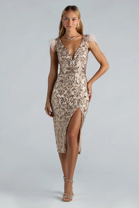 Ada Formal Sequin Feather Midi Dress