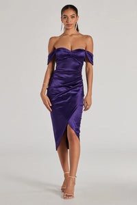 Wow them all with your chic allure in the elegant and sleek Zoey formal satin mermaid dress. She features an asymmetric one-shoulder neckline with an off-the-shoulder short sleeve, pleated detailing at the bodice and waist, a wrap overlay at the waist, a hip-hugging fit, and a floor-sweeping hem with a mermaid silhouette. The smooth satin-knit fabric offers a moderate stretch. Complete the look for your next formal affair with rhinestone statement earrings.