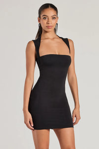 Show off your sleek chic style in this bodycon mini dress featuring a sleeveless square neckline, tank-like shoulder straps, and a short form-hugging silhouette. Style with stiletto heels for a rooftop bar!