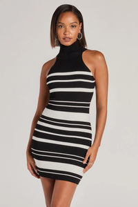 This sleeveless knit mini dress boasts a turtle neckline and a bodycon silhouette with a trendy striped pattern. Style with simple hoop earrings for any casual plans.