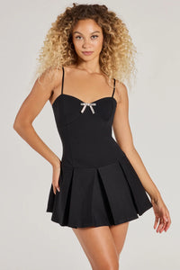 Give yourself the gift of style with this sleeveless ponte romper featuring a gorgeous rhinestone bow along the sweetheart neckline, a trendy drop waist design, and a short pleated fit-and-flare silhouette for a flirty flair. Perfect for a school dance or party.