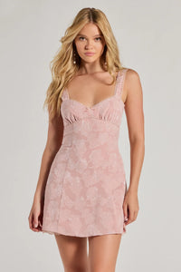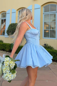 Showcase your beauty in this floral lace mini dress detailed with a dainty eyelet lace trim for a delicate accent. It features a sleeveless V-neckline with a mini bow detail, thin tank shoulder straps, a partially open back with an adorable tie-back bow design, and a sweet short A-line silhouette.