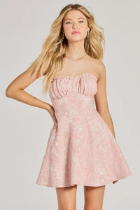 A strapless floral skater dress features a flirty corset bodice and a flattering skater mini-length silhouette. Perfect for a brunch or party.