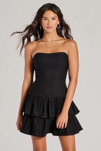 This strapless mini dress features a fitted skater silhouette and a tiered ruffled hem for added flirtiness. The woven-lined fabric has slight stretch and a polished look.