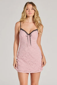 - V-neckline, floral lace bust overlay, small rosette bow detail
