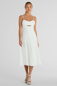 Create a sensational look in this effortlessly chic midi dress on your next weekend getaway. The small cutout below the bust adds a touch of allure to the flowy A-line silhouette.