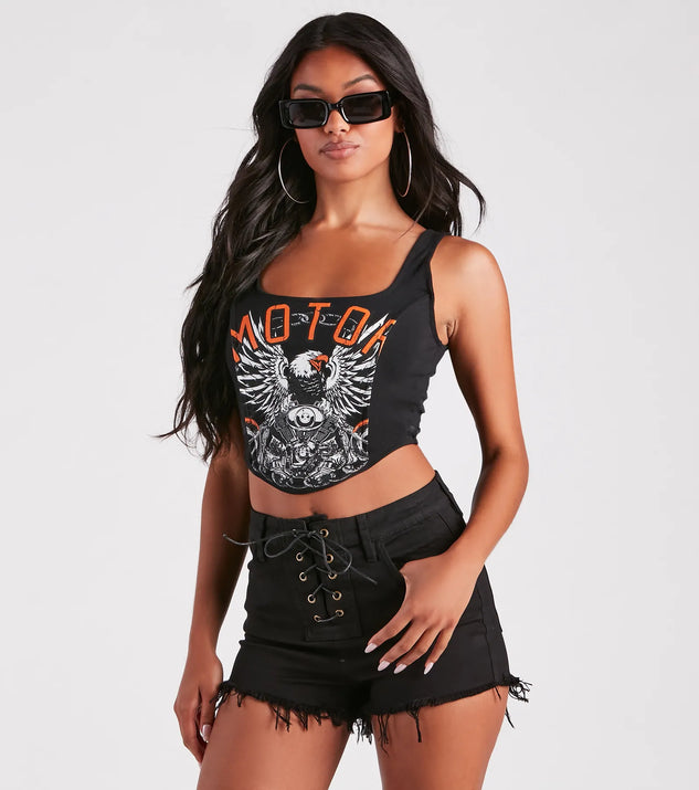 Show off your love for edgy vibes with this cool-girl graphic cropped tank. It features a sleeveless scoop neck and back design, thin tank shoulder straps, dual front curved seams with flexible boning inserts, a fitted, pointed, cropped hem, and a front eagle and motorcycle graphic with the script, "Motor." Style with destructed denim shorts and combat boots!