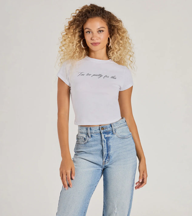 This graphic tee features a classic crew neckline, short sleeves, and a sassy front graphic script that reads "I'm Too Pretty For This" along the cropped fitted hem. Perfect for casual styling with jeans or a skirt.