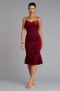 Oh-so-chic, this curve-hugging midi dress is designed with lined mesh fabric with a gorg floral velvet burnout pattern. It features a sleeveless cowl neckline, adjustable spaghetti straps to find your customized fit, and a midi-length mermaid silhouette.
