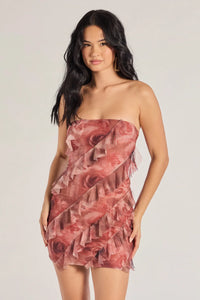 Flirt it up in this adorable lined mesh mini dress accented with a blooming floral print! It features a strapless straight-across neckline, an asymmetric ruffled design, and a short bodycon silhouette to showcase your gorgeous curves.
