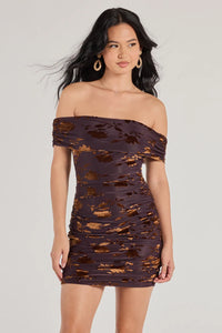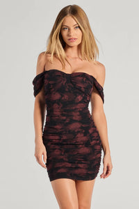 Channel a romantic aura in a mini dress with an off-the-shoulder neckline, a foldover accent, ruching that enhances curves, and a gorge flocked velvet floral print. Pair the dress with a sleek clutch for the perfect date night outfit.
