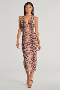 Serve sultry and sassy vibes in this curve-hugging midi dress made with lined mesh fabric with a bold zebra print pattern. It features a sleeveless cowl neckline, tie-back halter straps, an alluring open back, and a twisted lower back design with ruched detailing.
