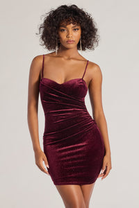 Show up looking sultry and luxe in this glitter velvet mini dress featuring a sleeveless sweetheart neckline with a wrap-front design and front pleated detailing to accentuate your stunning curves. The short bodycon silhouette makes it perfect for a night out paired with stiletto heels.