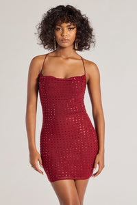 Glitz up the night like you the glam babe you are in this figure-flaunting mini dress designed with lined mesh fabric with all-over tonal rhinestone embellishments for a gorgeous sheen. It features a sleeveless cowl neckline, spaghetti straps that lead to an open back with a cross-back strappy design, and a short bodycon silhouette.