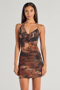 Show off a fierce allure in this airy mesh mini dress designed with an abstract animal print that will turn heads. It features a sleeveless draped cowl neckline, a halter strap design with sleek O-ring accents, and a short bodycon silhouette to highlight your gorgeous curves.