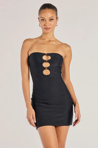 Serve sultry style your next night out in this iconic mini dress featuring a strapless straight neckline, alluring bust cutouts with sleek O-ring accents, and a short bodycon silhouette to flaunt your figure. Complete the look with stiletto heels.