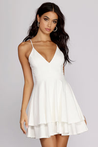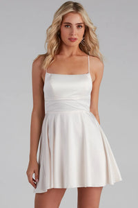 Slay the night away in our beautiful Sonya satin skater dress! She features a sleeveless square neckline with a built-in padded bust for support, adjustable spaghetti straps, and a cross-back lace-up design that lets you adjust the fit. Her short skater skirt is flowy enough to make some dance moves tonight! The short dress is composed of a satin-like woven fabric fabric that has a very flattering finish. Style this dress with sparkling earrings and classic block heels.