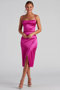 Enchant them all with the captivating Lillyanne formal midi dress! She features a sleeveless bodice, a trendy cowl neckline, adjustable spaghetti straps for a customized fit, and a strappy cross-back design. Her high waist seam elongates your silhouette and leads to a mid-length skirt with an asymmetrical wrap hem creating a front slit. The midi dress is composed of a satin fabric that offers a curve-hugging fit with a moderate stretch. Complete the look with clear heels and a sleek satin clutch.