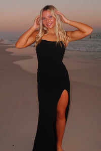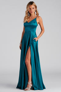 The Marissa long satin dress brings elegance and sultriness to your formal night. The floor-length gown enhances your curves with a fitted bodice and flattering A-line silhouette while the high front slit provides movement.