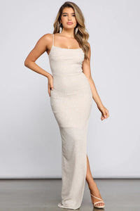 Flaunt your glam style in the fabulous Lola high slit glitter dress! She features a trendy cowl neckline with a slim-fit bodice, a floor-sweeping silhouette with a sultry high side slit to elongate your legs, and a form-hugging fit. She is composed of glitzy glitter knit fabric that offers a curve-hugging fit with a moderate stretch. Pair this gorgeous long dress with a sleek ring set to add some glamour to your look for your special occasion.