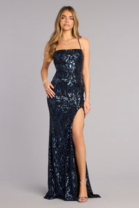 Chic and glamorous, the Rowena sequin mermaid long dress will stylishly elevate your formal night-out look. With a lace-up strap design and fitted mermaid silhouette with a high slit, you'll deliver stunning style.