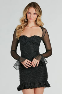 Radiate eye-catching energy in the Kristy formal glitter mini dress perfect for twirling all night out on the dance floor! She features adorable sheer fitted long sleeves with ruffled cuffs, a sweetheart neckline with a padded underwire bust, and a head-turning open back with a tie closure. Flaunt your curves in her bodycon silhouette showcasing side ruched seams and a flirty ruffled mini-length hem. The formal dress is composed of a glitter mesh fabric that sparkles and has a sewn-in knit lining. Complete the look in platform heels for a sweet sixteen or holiday party!