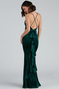 Bring the elegance in a formal prom dress that showcases your timeless style. Margot features a sleeveless V-neckline, spaghetti straps that lead to a cross-back design, and a bow accent at the lower back that leads to a ruffled trim. She is composed of a lined velvet fabric that offers a form-hugging fit with a moderate stretch. Complete your prom-ready look with rhinestone heels and a faux fur wrap.