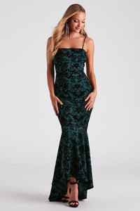 Leave every room making people's jaws drop in the sophisticated and sultry Liyah formal dress perfect for holiday balls or winter weddings! She features a classic sleeveless square neckline, bust lining, spaghetti straps, and a high-waist seam that leads to her form-hugging, mermaid silhouette, and ruffled high-low hem. The formal dress is composed of a woven fabric with a flocked velvet pattern and minimal stretch. Style with a rhinestone bracelet and heels to complete your dressy look!
