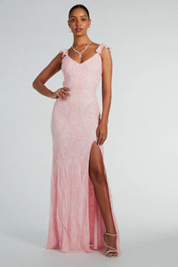 Glittery sequins add undeniable shine to the Estella long formal dress perfect for prom or black-tie occasions! With a mesmerizing sequin scroll pattern on delicate mesh fabric, this gown is sure to receive many compliments. The V-neckline and padded bra cups provide a flattering fit, while the ruffle trim adjustable spaghetti straps and open back add an eye-catching detail. The column silhouette and high front slit create a stunning, figure-hugging look that captures all the attention.
