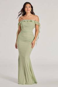 Designed to turn every step into a moment, the Sherrie mesh gown features a ruched bodice, delicate straps, and a cascading ruffle slit that adds movement and allure. The fitted silhouette flows effortlessly, giving just the right balance of romance and drama.