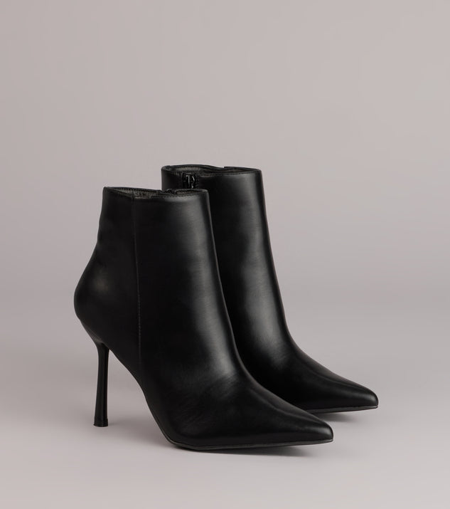 Sharp, sleek, and endlessly versatile. These faux leather booties feature a pointed toe and stiletto heel that instantly elevate everything from denim to dresses and skirts.