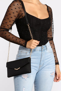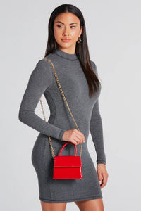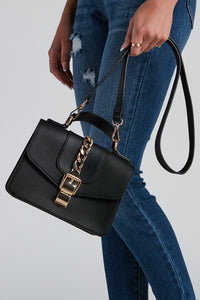 Bring those endlessly chic vibes with a crossbody that elevates your sophisticated outfits. The crossbody features a rectangular-shaped body, a fold-over closure with turn-lock closure, a chunky chain-link accent, a top handle, and a removable shoulder strap. The crossbody is composed of a faux leather material. Complete look with a bodysuit and tie-waist pants.