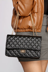 Bring the glam with a crossbody that features sophisticated deets! The crossbody features a diamond quilted design, a turn-lock accent, and a large rectangular body with fold-over closure. Complete look with a mini skirt and bodysuit.